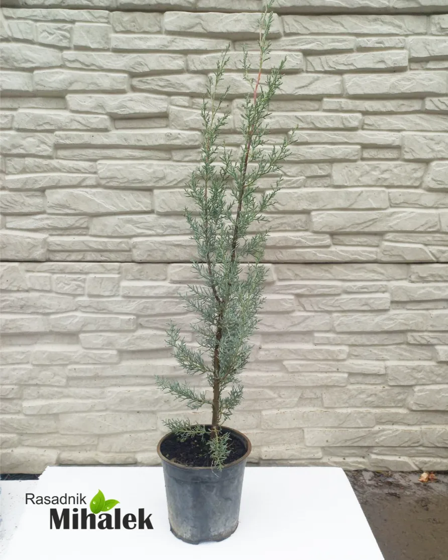 Cupressus arizonica – arizonski čempres je zimzeleno četinarsko drvo prepoznatljivo po upečatljivoj plavo-zelenoj boji iglica i konusnom obliku krošnje. Arizonski čempres ima piramidalan do stubast rast, što ga čini izuzetno atraktivnim u pejzažnom uređenju. Može da dostigne visinu od 12 do 18 metara, uz širinu krošnje od 4,5 do 6 metara, u zavisnosti od uslova uzgoja. Ova vrsta raste umereno brzo – dok u suvim staništima napreduje sporije, u plodnijem tlu s dovoljnom vlagom može rasti do 90 cm godišnje. Sadite ga na sunčanom ili delimično osenčenom mestu. Životni vek arizonskog čempresa obično se kreće između 30 i 50 godina, pri čemu na njegov razvoj značajno utiču ekološki faktori. Zbog svoje otpornosti, dekorativne vrednosti i prilagodljivosti različitim uslovima, često se koristi u hortikulturi za ozelenjavanje dvorišta, parkova i zaštitnih pojaseva. U ponudi su sadnice visine 70-90 cm, čiji izgled možete videti na fotografiji broj 4 (17.12.2025).