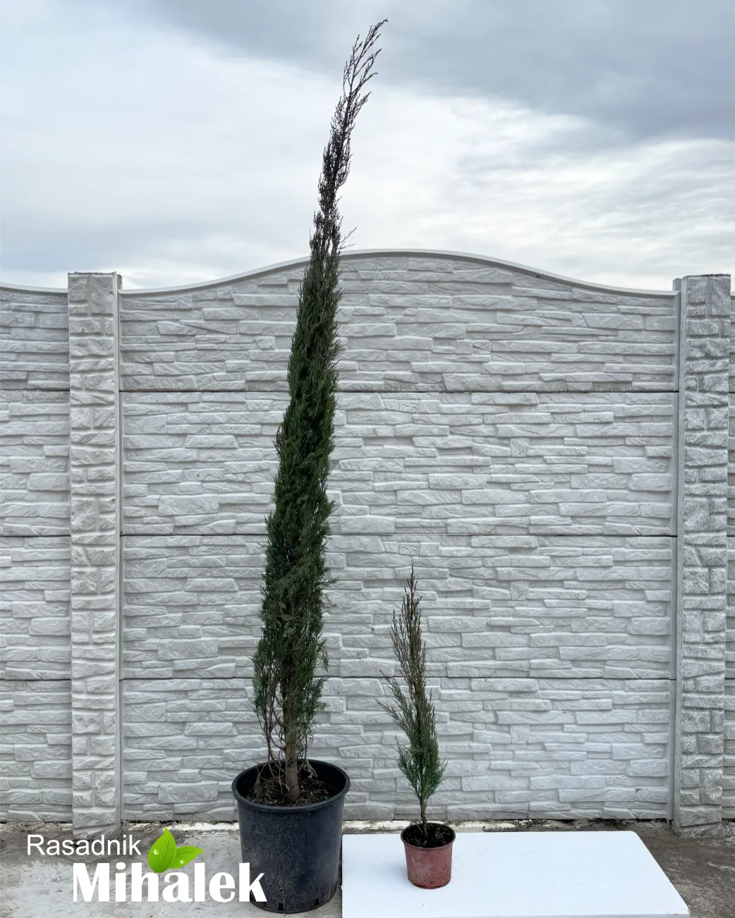 Cupressus sempervirens Totem – elegantno zimzeleno drvo koje svojim vitkim, stubastim oblikom unosi sofisticiranost u svaki vrt, prilaz ili terasu. Može dostići visinu od 8-10 m, dok mu je širina svega 1 m. Njegova gusta, bujna zelena krošnja ostaje postojana tokom cele godine, a osim vizuelne privlačnosti, ovaj čempres odiše blagim, prirodnim mirisom. Poreklom je iz mediteranskih krajeva. Izuzetno je otporan na sušu, mraz i urbane uslove, što ga čini odličnim izborom za različite klime. Bilo da se koristi kao živa ograda ili ukrasna soliterna biljka, ovaj četinar unosi dozu klasične lepote u svaki prostor. Njegova trajna privlačnost čini ga idealnim dodatkom za dvorišta i vrtove. Razliku između veće i manje sadnice možete videti na fotografiji broj 4 (11.02.2026).
