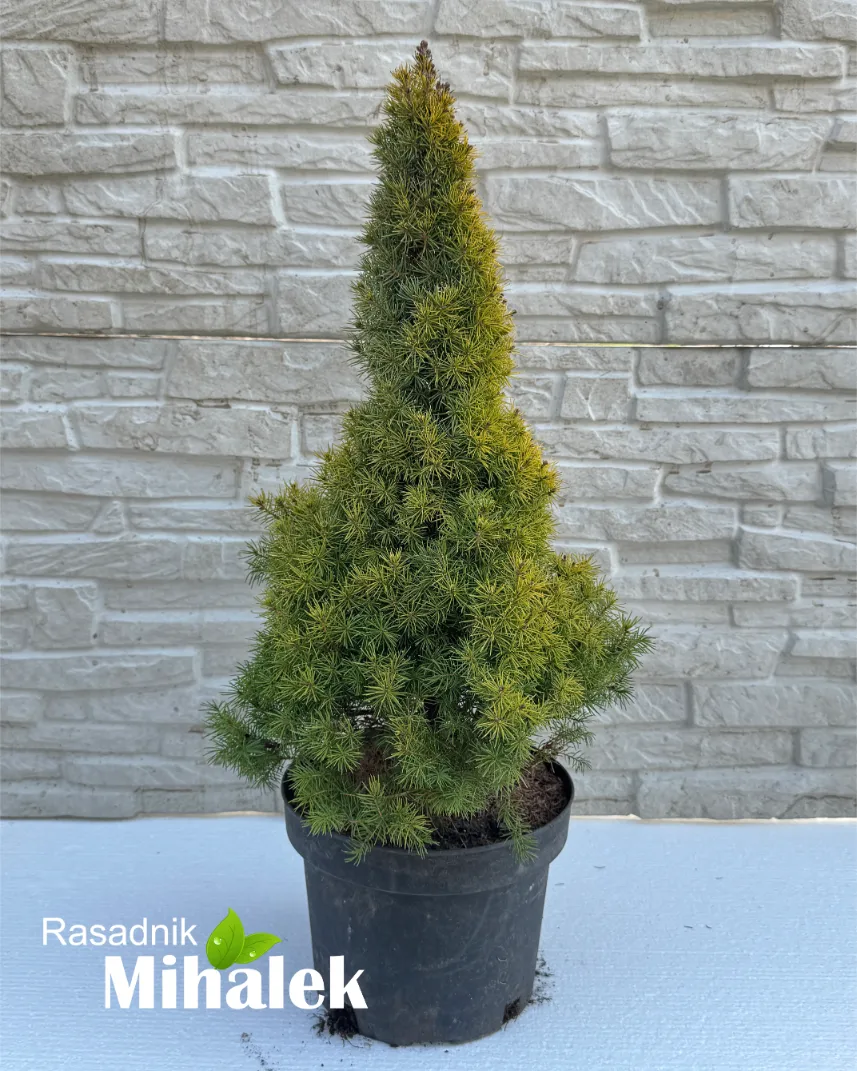 Picea glauca conica maigold je patuljasta, spororastuća forma bele smrče pravilnog, gustog i piramidalnog oblika. Odlikuje se izuzetno urednim habitusom i kompaktnim rastom, pa u punoj zrelosti dostiže oko 3 m visine i do 2 m širine, dok za prvih desetak godina naraste približno 100-120 cm. Posebnu dekorativnost pokazuje u proleće, kada se na vrhovima grana pojavljuju meki, svetlo zlatno-žuti izbojci koji stvaraju lep kontrast sa starijim, tamnozelenim četinama. Tokom leta boja postepeno prelazi u intenzivniju zelenu nijansu. Četine su guste, prijatnog mirisa smole, a biljka zadržava lep izgled tokom cele godine jer je zimzelena. Najbolje uspeva na sunčanom položaju ili u blagoj polusenci. Nije zahtevna po pitanju zemljišta, ali joj prijaju dobro drenirana, umereno vlažna tla, dok ne podnosi zadržavanje vode. Korenov sistem je plitak i razgranat, pa se starije biljke teže presađuju i osetljivije su na jake vetrove. Otporna je na sneg i niske temperature. Zahvaljujući sporom rastu i pravilnoj formi, idealan je izbor za male vrtove, kamenjare i mešovite zasade sa četinarima i perenama. Odlična je i za sadnju u većim saksijama na terasama i balkonima, gde tokom cele godine unosi strukturu i svežinu u prostor. U ponudi su sadnice visine 30-50 cm, čiji izgled možete videti na fotografiji broj 4 (04.03.2026).