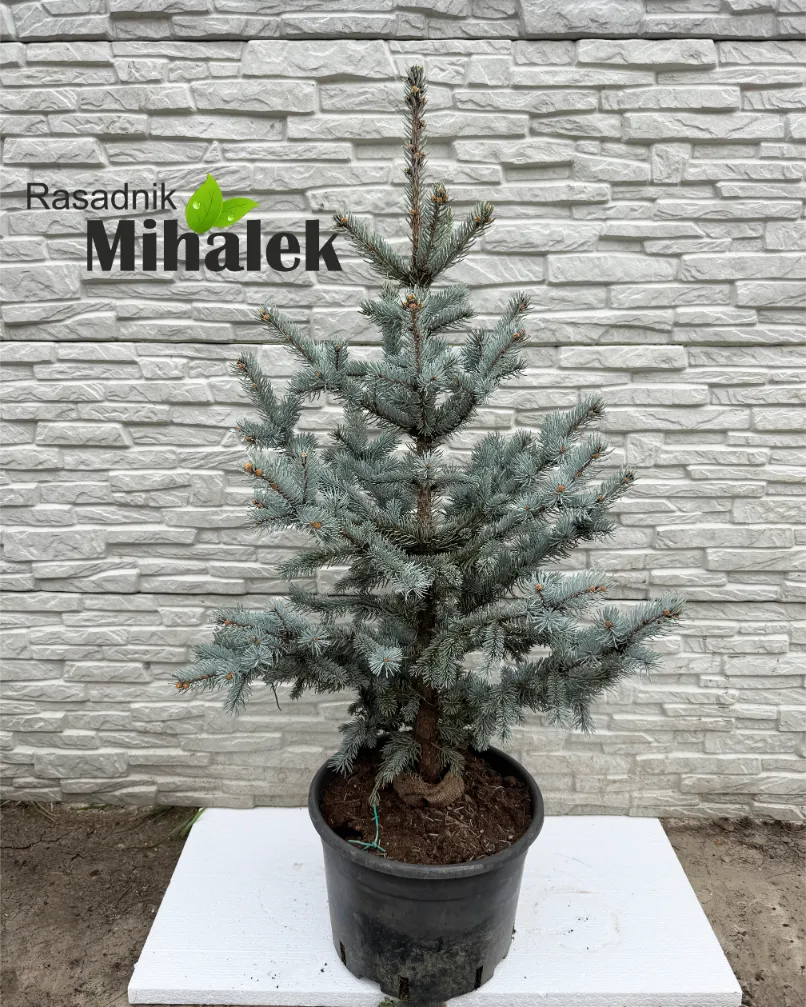 Picea pungens hoopsii je spororastući visoki četinar koji je specifičan po gustim srebrno-plavim četinama. Smatra se da je ovo jedan od najplavljih kultivara. Ako je izložen celodnevnom suncu, formiraće gustu krošnju i imaće gotovo pravilnu piramidalnu formu, mada dok je biljka mlada izgledaće kao da nema pravilnu formu, tj. oblik (mi ih orezujemo prve dve do tri godine). Dostiže visinu 4-7 m, a širinu 2-3 m. Za prvih desetak godina možete očekivati visinu 2,5-3m. Najčešće se sadi u vrtovima srednje veličine, mada dobro podnosi orezivanje, pa se može saditi i u manjim vrtovima. Ako imate potrebu za orezivanjem, onda to radite rano u proleće. Što se tiče zemljišta, odgovara joj neutralno do blago kiselo tlo koje je dobro drenirano. U ponudi su sadnice u busenu visine 120-140 cm, čiji izgled možete videti na fotografiji broj 3 (17.03.2026).