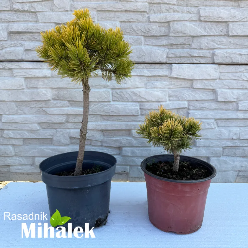 Pinus mugo carstens wintergold je kalemljeni patuljasti zlatni bor. Njegove iglice su zlatno-žute od novembra, pa sve do maja. Odgovara mu sunčano mesto. Bilo bi dobro da je zemljište blago kiselo. Dostiže visinu 80-120 cm i širinu od 100-130 cm. Raste veoma sporo, tako da krajnju visinu i širinu možete očekivati tek nakon desetak godina. Veoma je dekorativan u malim vrtovima i kamenjarima. Podarite mu posebno mesto u vašem vrtu, sigurno neće ostati neprimećen. Razliku između veće i manje sadnice možete videti na fotografiji broj 2 (06.03.2026).