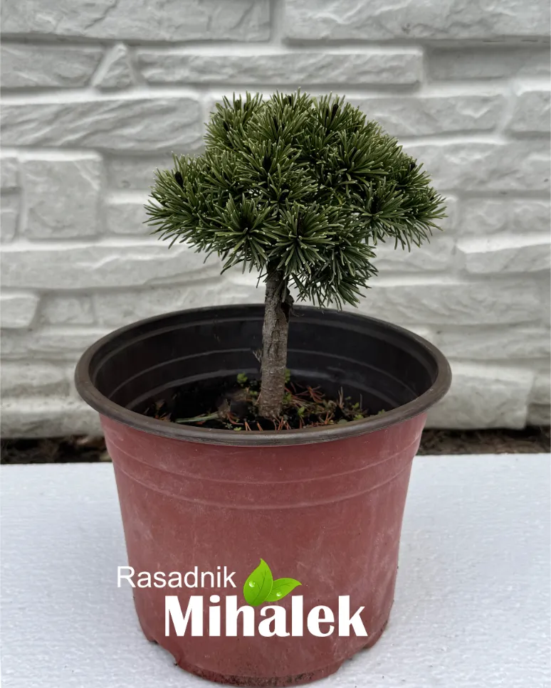 Pinus mugo mops je patuljasti četinar koji može dostići visinu i širinu do 1 metra. Raste veoma sporo, pa ga je najbolje saditi u kombinaciji sa nižim perenama, niskim grmovima i patuljastim četinarima. Najlepši je rano u proleće, kada njegovi pupovi izgledaju kao srebrne loptice. Zelene je boje. Odgovara mu sunčana pozicija i polusenka. Ne voli previše vlage. U ponudi su nisko kalemljene sadnice na visinu od 5-10 cm + krošnja 15-20 cm, čiji izgled možete videti na fotografiji broj 2 (12.03.2026).