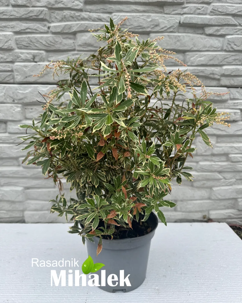 Pieris japonica white rim je prelep zimzeleni žbun koji unosi interesantnu notu u vrt tokom cele godine. Odlikuje se sjajnim, tamno zelenim listovima koji imaju upečatljiv beli rub, dok je mladi porast nežno ružičasto-crvenkast. U rano proleće, ovaj pieris dodatno očarava grozdovima sitnih, zvonastih belih cvetova koji unose eleganciju i svežinu u prostor. Za deset godina ovaj žbun dostiže visinu i širinu od oko 90–120 cm, pa se savršeno uklapa u žive ograde, ivične sadnje ili kao soliterna biljka. Idealan je za polusenovita mesta i lako se održava.